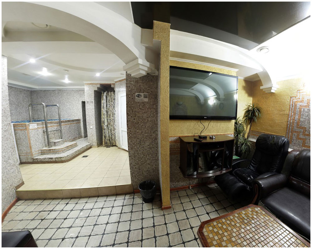 В номере «БАССЕЙН» есть: финская парная на 6 человек, бассейн с фильтрацией и подсветкой с холодной водой, комната отдыха с мягким диваном, столом, телевизором 42″ со спутниковым ТВ, отдельная массажная комната отдыха с мягкой кроватью и зеркальным потолком, массажное кресло, услуги бара, кальян, дубовые и березовые веники, массаж. Работает бесплатный интернет WiFi.